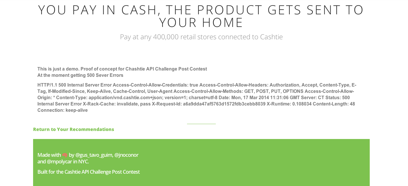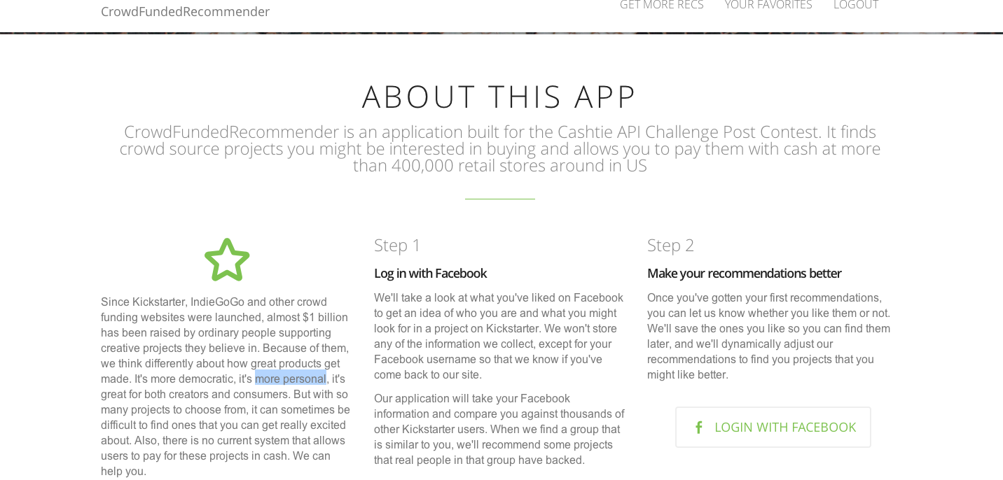 Proof of concept application that gives users customized recommendation on crowd funded projects and allow them to buy these at retail stores. The application uses clever algorithms to find products based on a user's Facebook likes. Cashtie API integration will allow payment for these crowd funded projects at retail stores. Great benefit to retail stores as they will be able to offer to their customers new great products that have received the public approval on crowd funding websites.